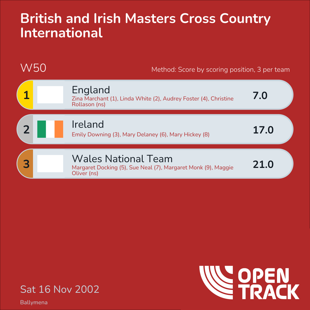 | 3 | WALES | 21.0 | 69: Margaret Docking (5), 81: Sue Neal (7), 90: Margaret Monk (9) |