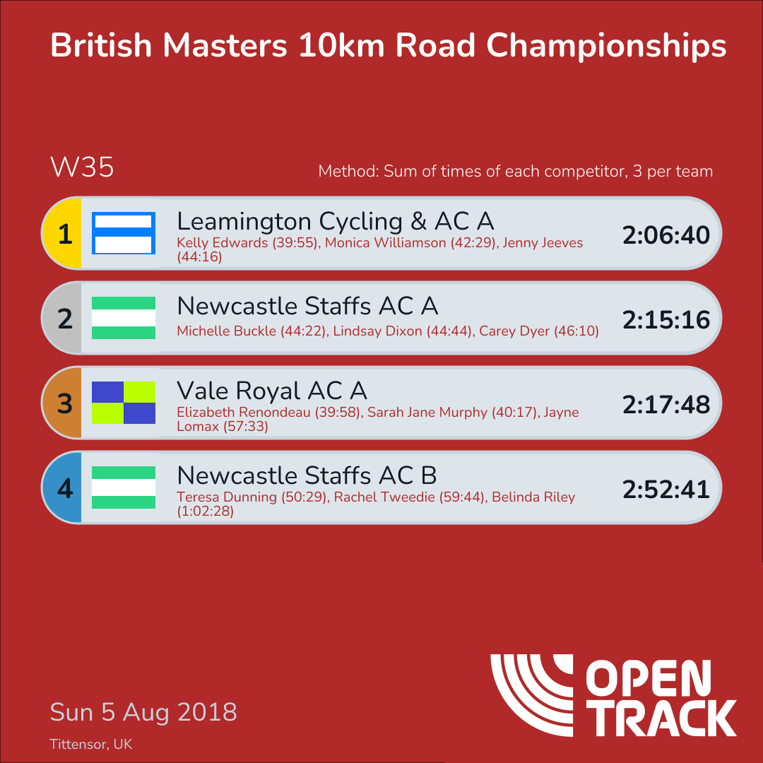 2:06:40 | 28: Kelly Edwards (39:55), 53: Monica Williamson (42:29), 65: Jenny Jeeves (44:16) | |
