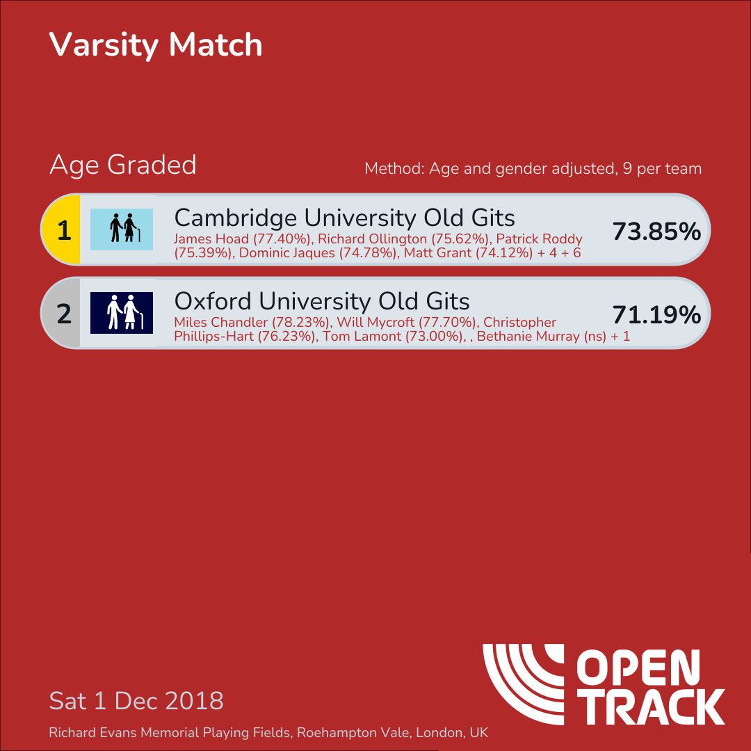| 2 | OUOG | 71.19% | 1: Miles Chandler (78.23%), 2: Will Mycroft (77.70%), 4: Christopher Phillips-Hart (76.23%), 12: Tom Lamont (73.00%), 22: Simon Molden (72.01%), 27: Andy Arbour (69.77%), 30: Andy Robinson (65.67%), 36: Jim Shemilt (67.70%), 38: Edie Oxlade (60.42%) |