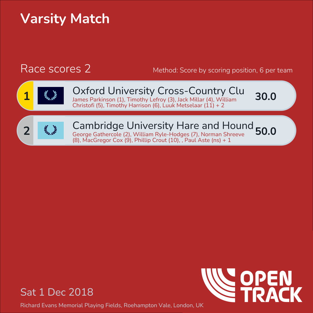 | 2 | CUHH | 50.0 | 2: George Gathercole (2), 7: William Ryle-Hodges (7), 8: Norman Shreeve (8), 9: MacGregor Cox (9), 10: Phillip Crout (10), 14: Joseph Massingham (14) |