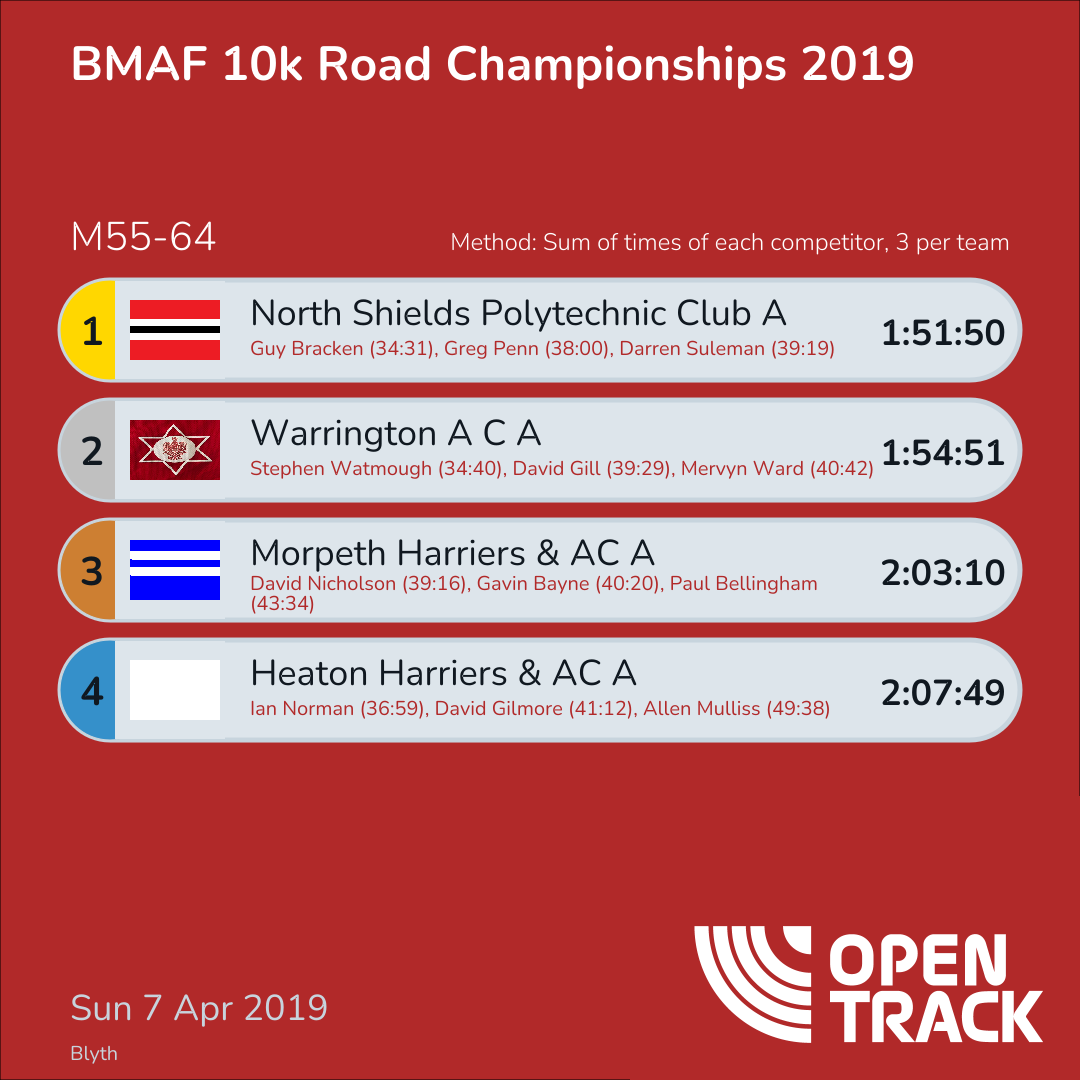 1:51:50 | 15: Guy Bracken (34:31), 46: Greg Penn (38:00), 68: Darren Suleman (39:19) | |