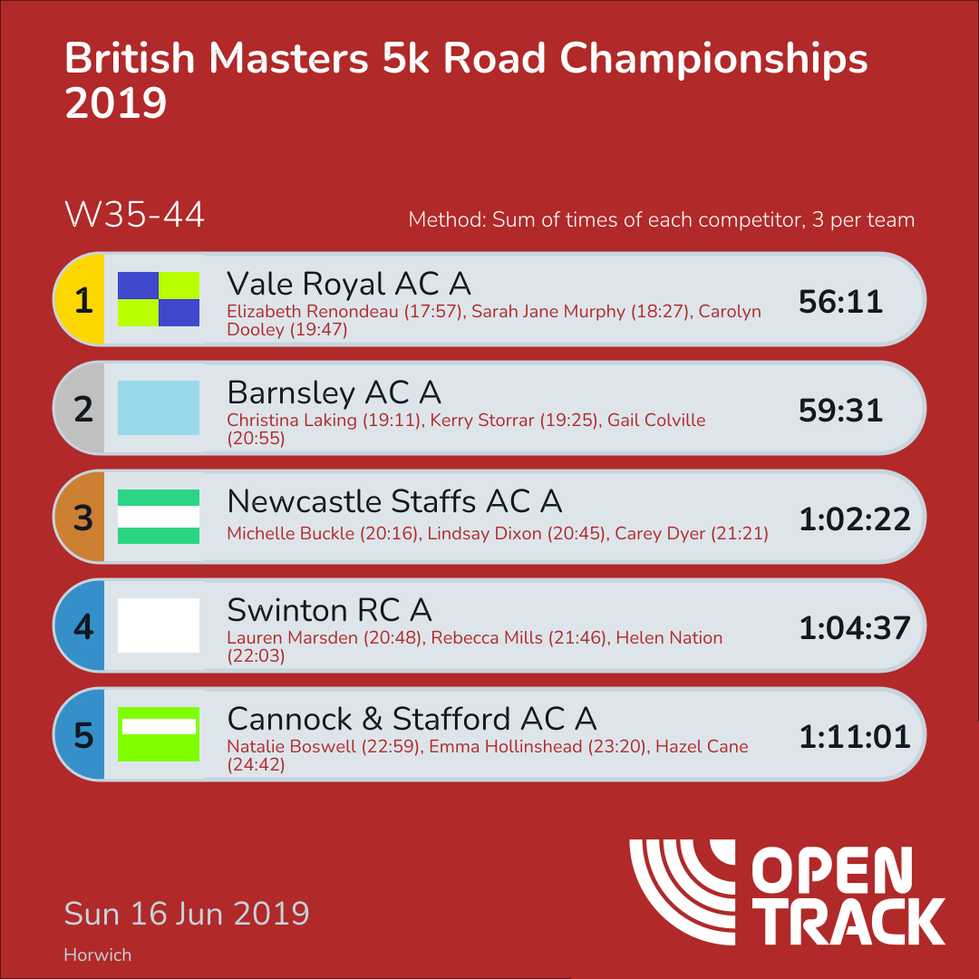 59:31 | 60: Christina Laking (19:11), 67: Kerry Storrar (19:25), 94: Gail Colville (20:55) | |