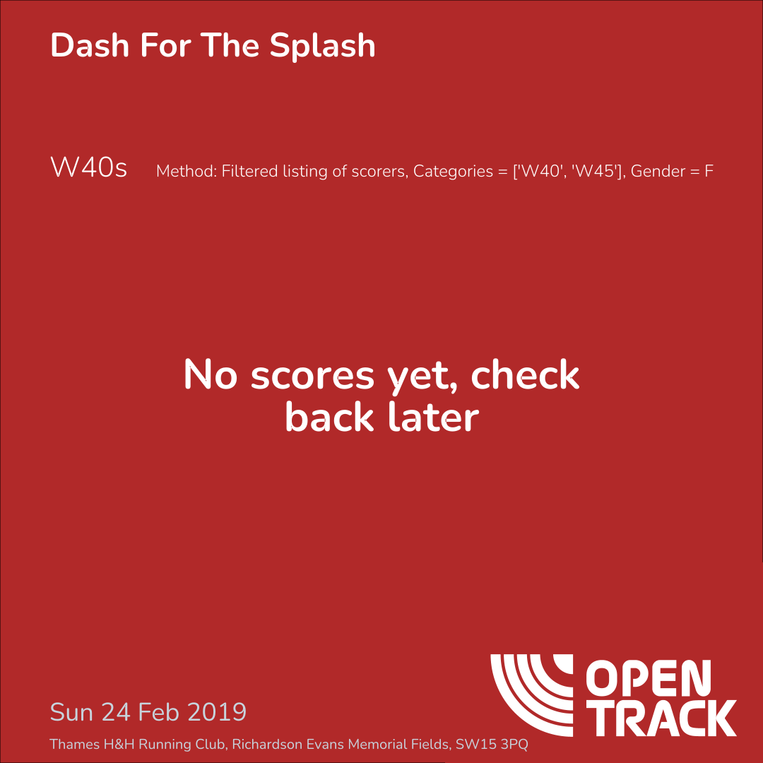 Method: Filtered listing of scorers, Categories = ['W40', 'W45'], Gender = F
