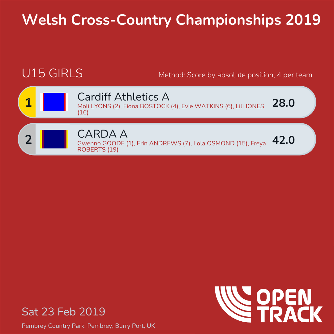 42.0 | 1: Gwenno GOODE (1), 7: Erin ANDREWS (7), 15: Lola OSMOND (15), 19: Freya ROBERTS (19) |