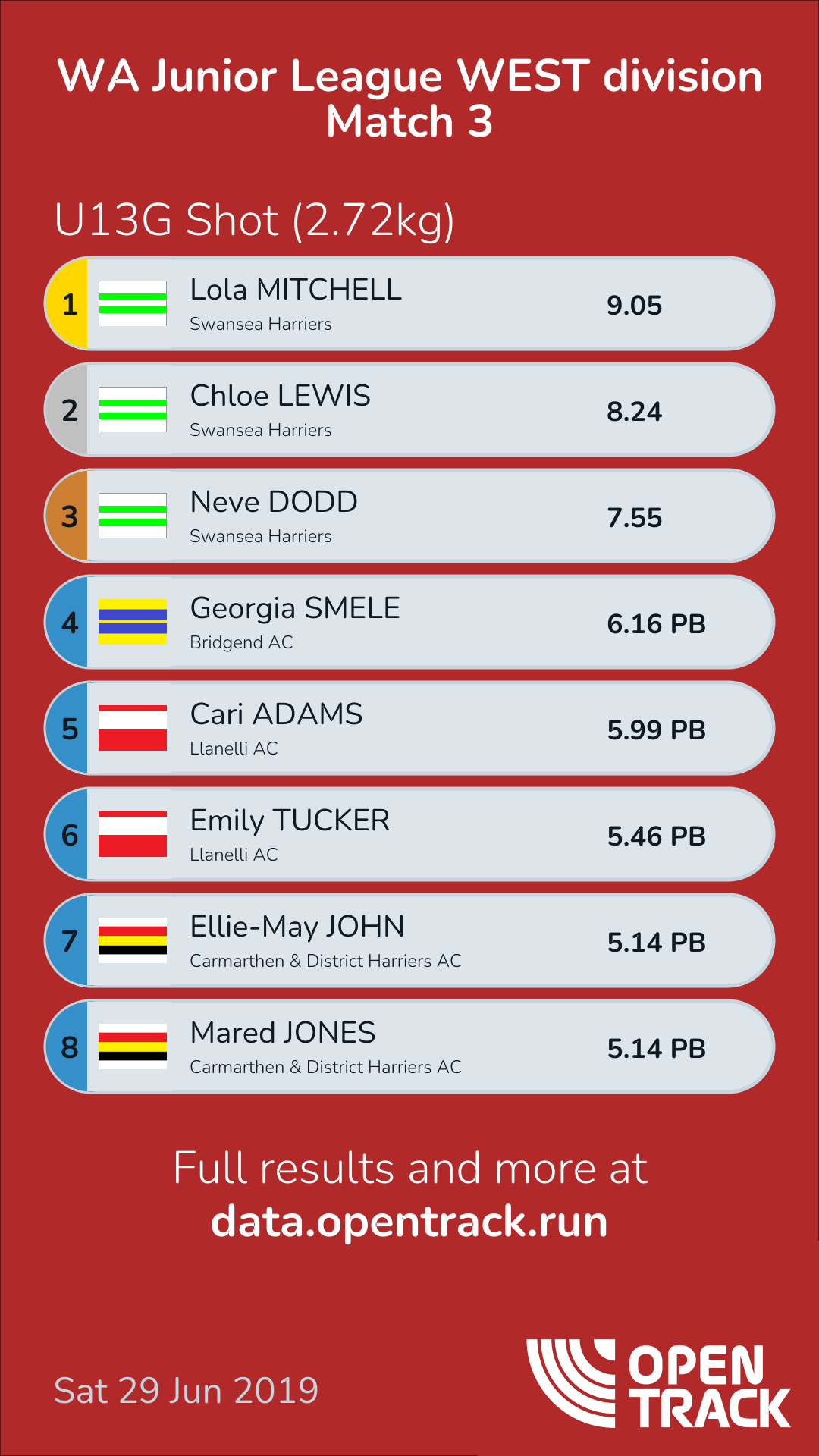 Meeting Record: Welsh Age Group Best: Adele NICOLL, Oswestry Olympians, 11.81, 2009 Jr Lge Rec: Nicola STEVENSON, Bridgend AC, 10.30, 2001: 10.30