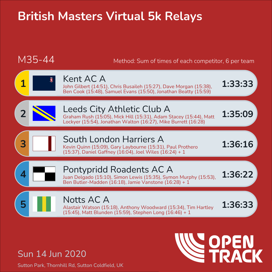 1:35:09 9Graham Rush (15:05)22Mick Hill (15:31)41Adam Stacey (15:44)60Matt Lockyer (15:54)131Jonathan Walton (16:27)134Mike Burrett (16:28)