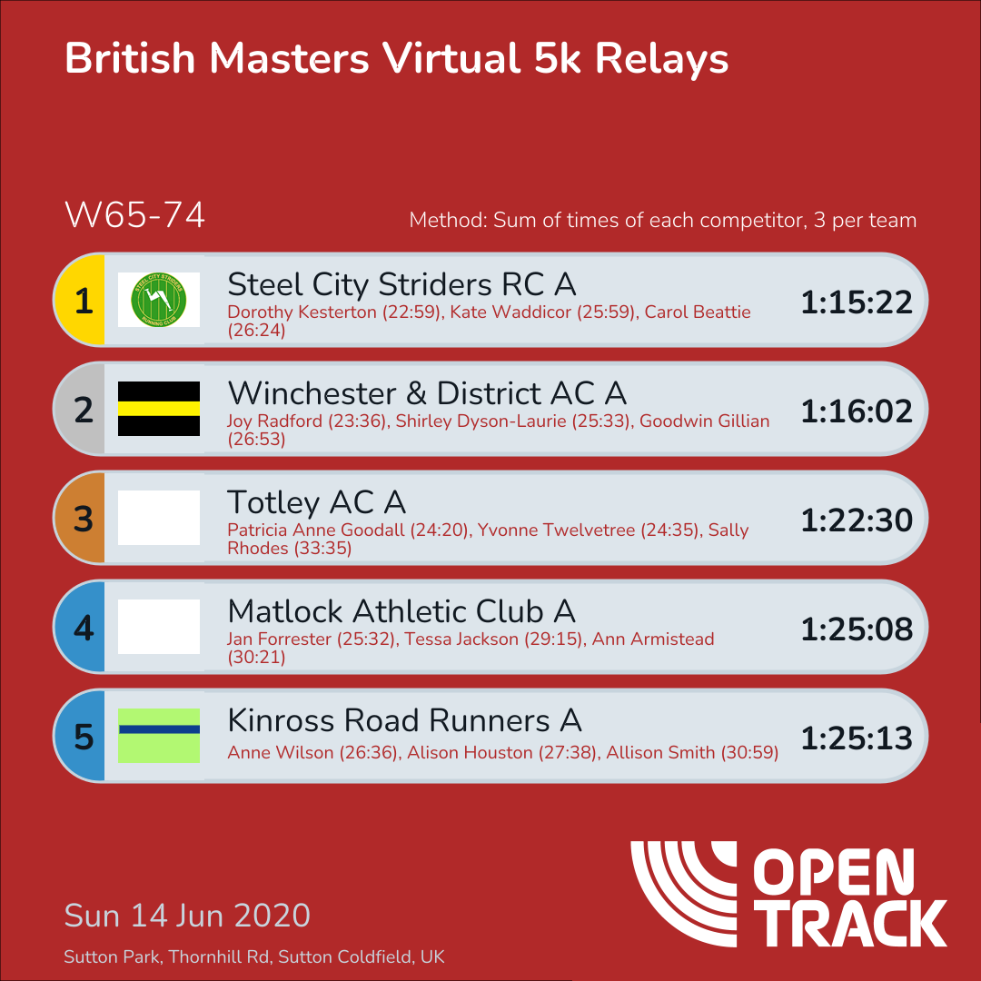 1:31:05 | 3164: Shelagh Hopkinson (29:37), 3180: Susan Coates (29:58), 3213: Elinor Newhouse (31:30) | |
