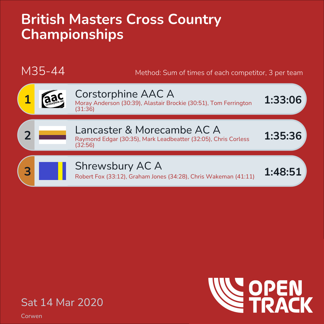 1:33:06 | 8: Moray Anderson (30:39), 11: Alastair Brockie (30:51), 19: Tom Ferrington (31:36) | |