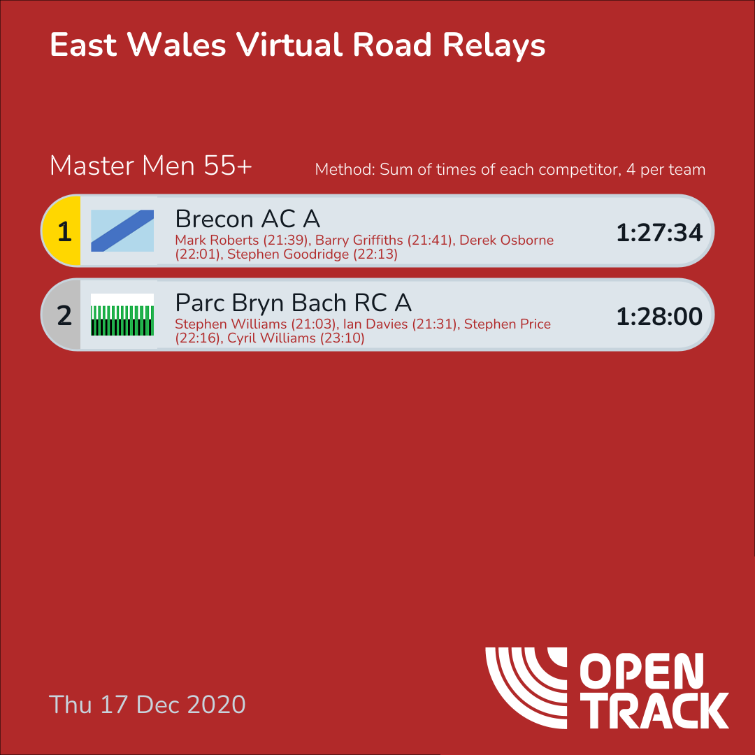 1:27:34 | 5: Mark Roberts (21:39), 6: Barry Griffiths (21:41), 7: Derek Osborne (22:01), 8: Stephen Goodridge (22:13) | |