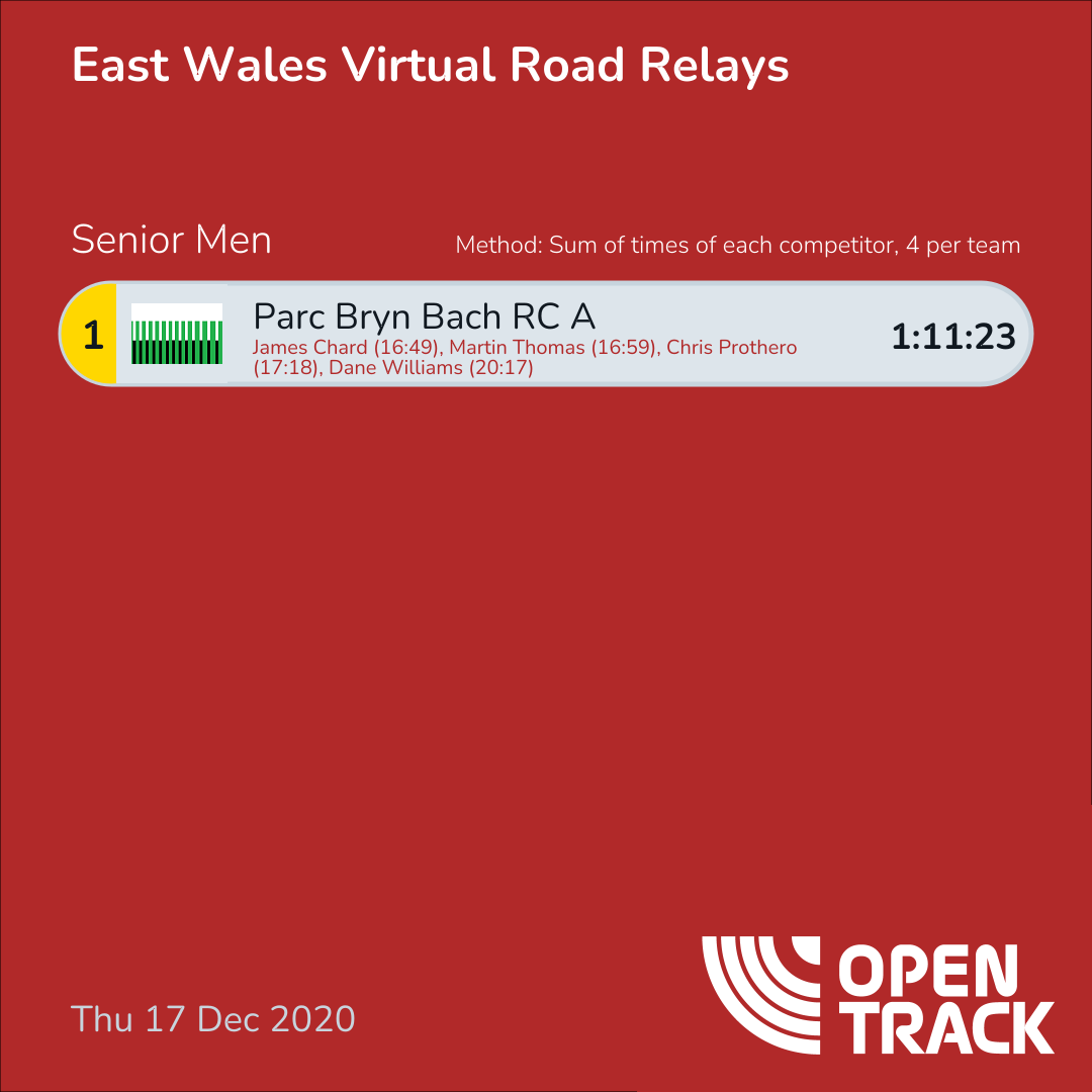 1:11:23 | 1: James Chard (16:49), 2: Martin Thomas (16:59), 3: Chris Prothero (17:18), 5: Dane Williams (20:17) |