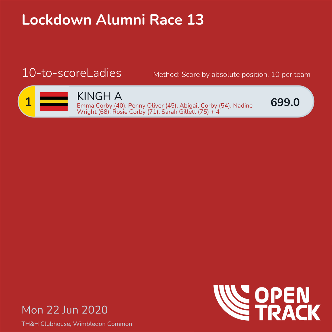 699.0 | 40: Emma Corby (40), 45: Penny Oliver (45), 54: Abigail Corby (54), 68: Nadine Wright (68), 71: Rosie Corby (71), 75: Sarah Gillett (75), 79: Caroline Friar (79), 81: Amy Oliver (81), 85: Joanna Bailey (85), 101: Jane Burns (101) |