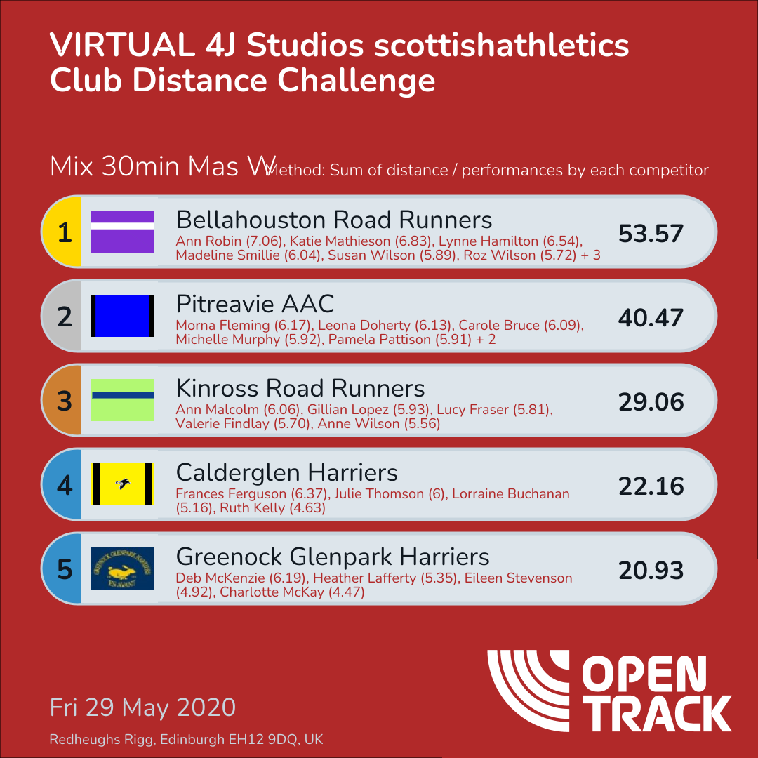 20.93 | 221: Deb McKenzie (6.19), 292: Heather Lafferty (5.35), 304: Eileen Stevenson (4.92), 311: Charlotte McKay (4.47) | |