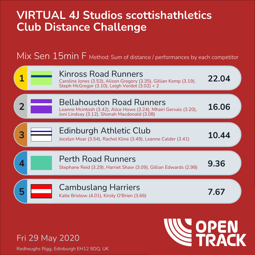 16.06 | 258: Leanne Mcintosh (3.42), 325: Alice Howe (3.24), 335: Mhairi Gervais (3.20), 354: Joni Lindsay (3.12), 367: Shonah Macdonald (3.08) | |