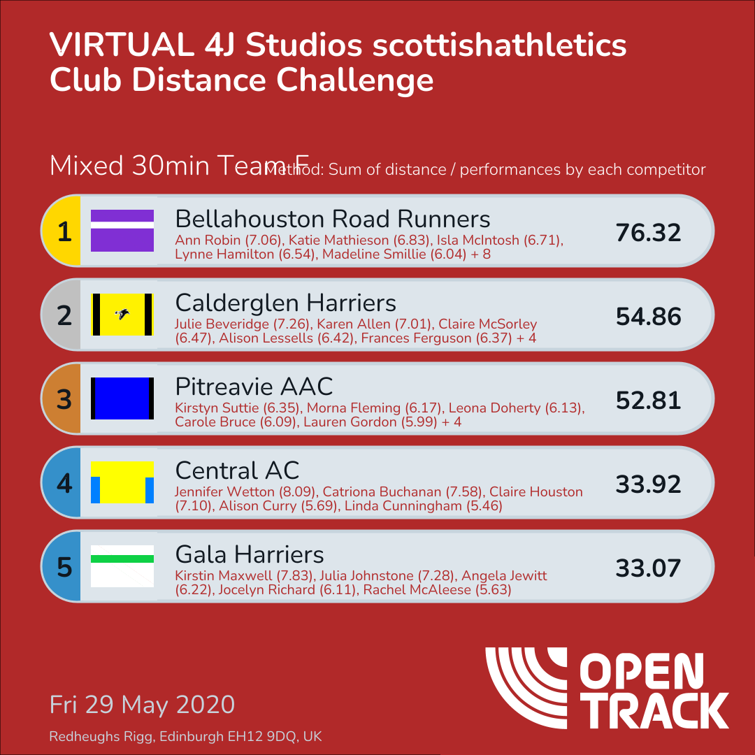 20.93 | 221: Deb McKenzie (6.19), 292: Heather Lafferty (5.35), 304: Eileen Stevenson (4.92), 311: Charlotte McKay (4.47) | |