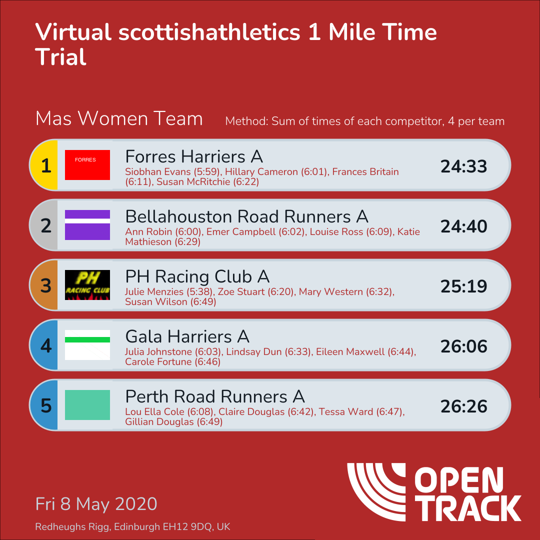 26:06 | 545: Julia Johnstone (6:03), 769: Lindsay Dun (6:33), 846: Eileen Maxwell (6:44), 858: Carole Fortune (6:46) | |