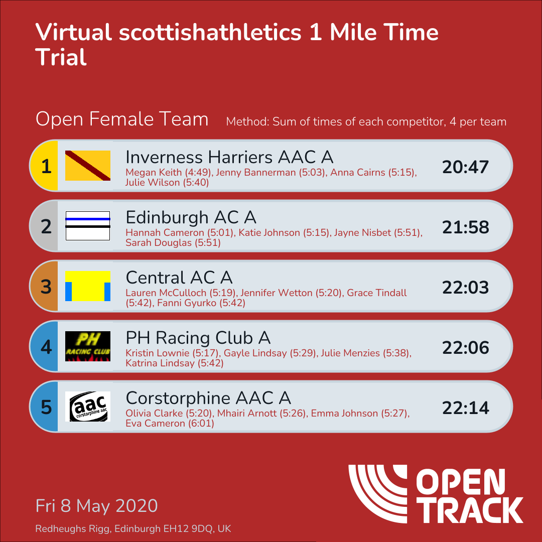 22:14 203Olivia Clarke (5:20)236Mhairi Arnott (5:26)242Emma Johnson (5:27)526Eva Cameron (6:01)