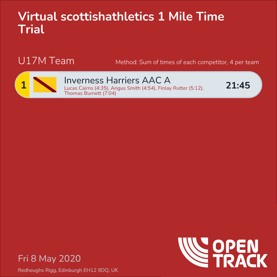 21:45 | 23: Lucas Cairns (4:35), 62: Angus Smith (4:54), 159: Finlay Rutter (5:12), 964: Thomas Burnett (7:04) |