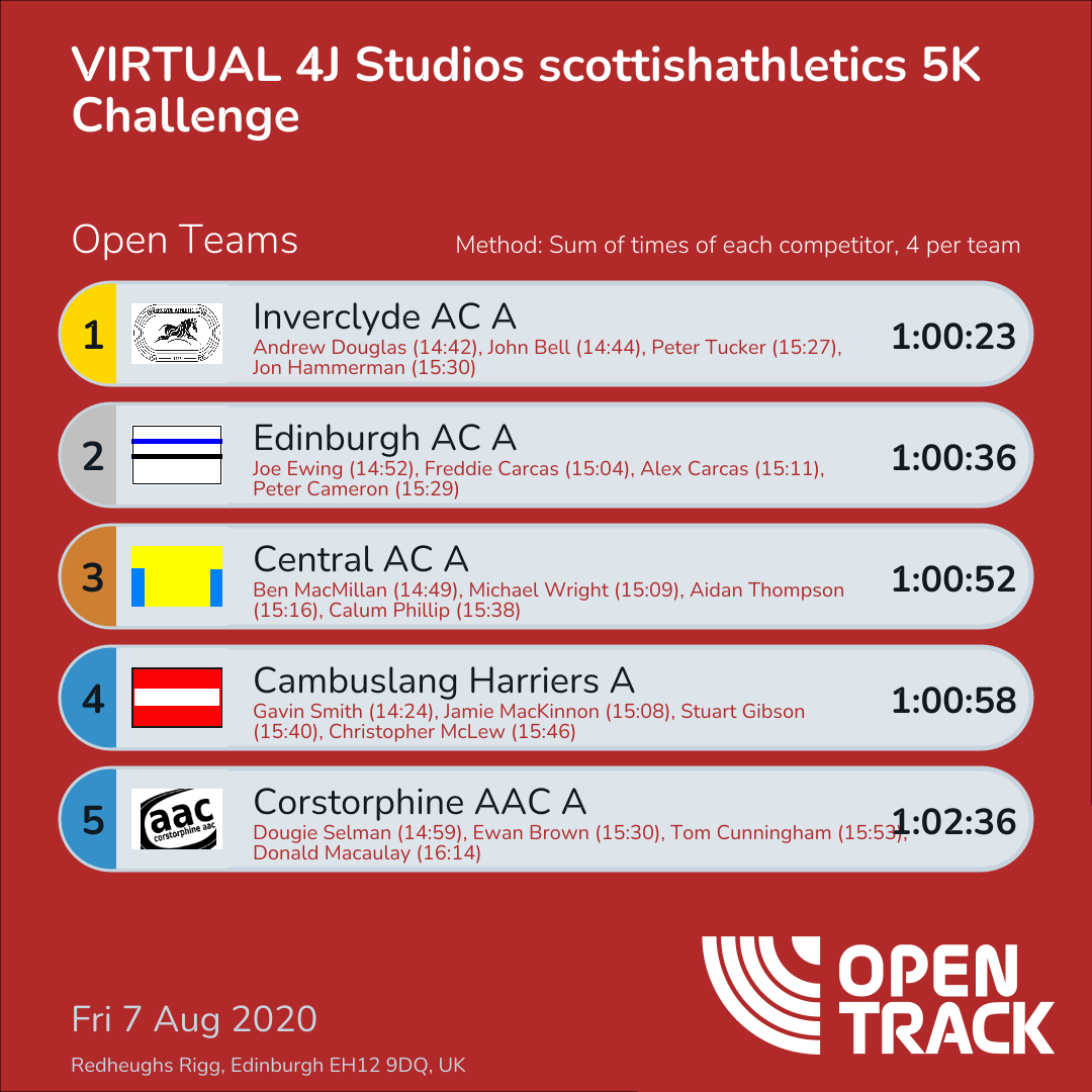 1:00:58 | 2: Gavin Smith (14:24), 16: Jamie MacKinnon (15:08), 41: Stuart Gibson (15:40), 47: Christopher McLew (15:46) | |