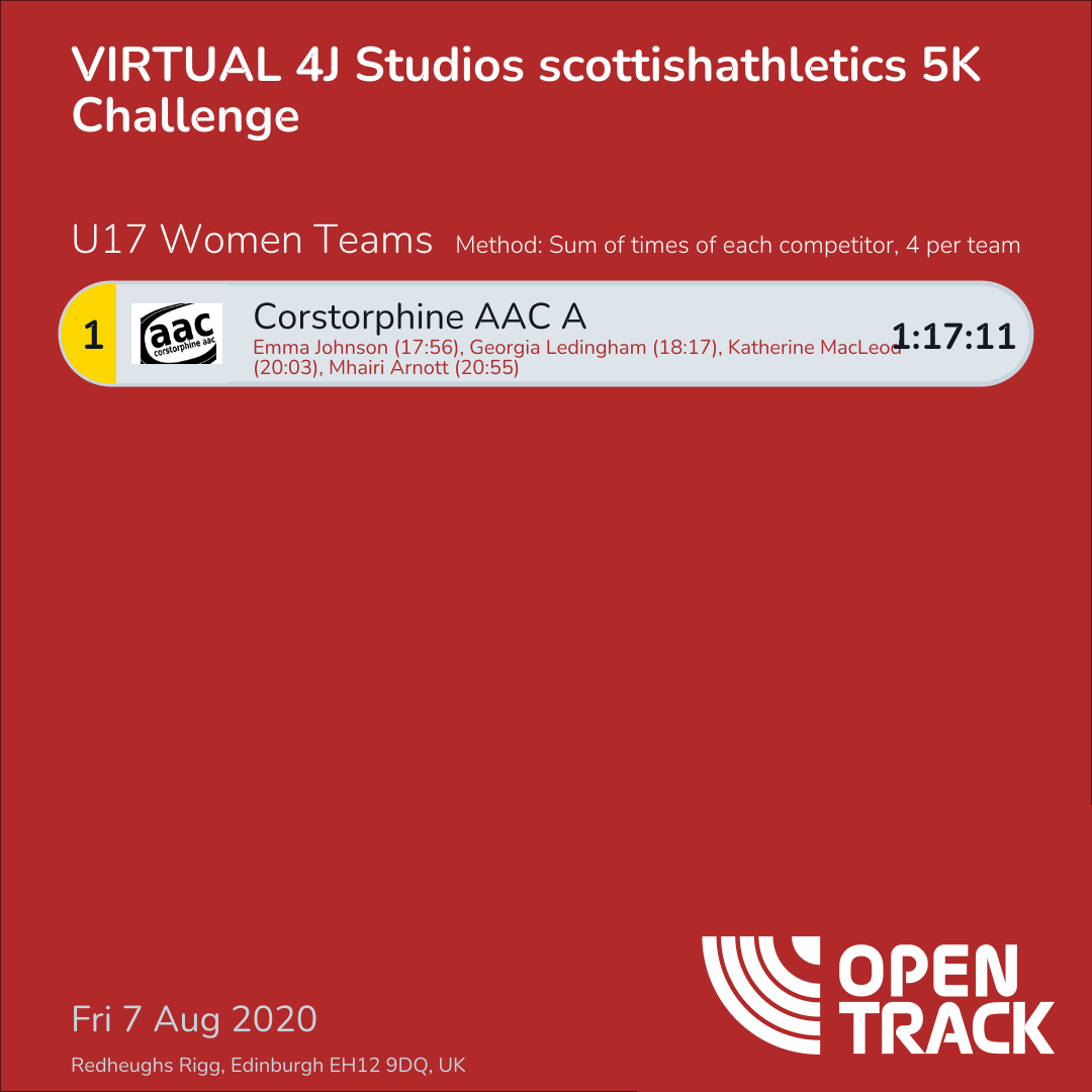 1:17:11 | 155: Emma Johnson (17:56), 173: Georgia Ledingham (18:17), 269: Katherine MacLeod (20:03), 307: Mhairi Arnott (20:55) |