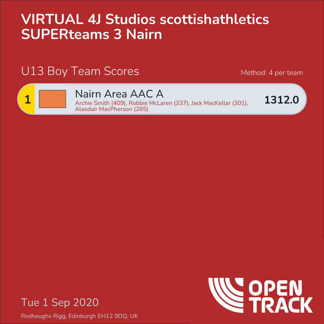 1312.0 | 1: Archie Smith (409), 2: Robbie McLaren (337), 3: Jack MacKellar (301), 4: Alasdair MacPherson (265) |