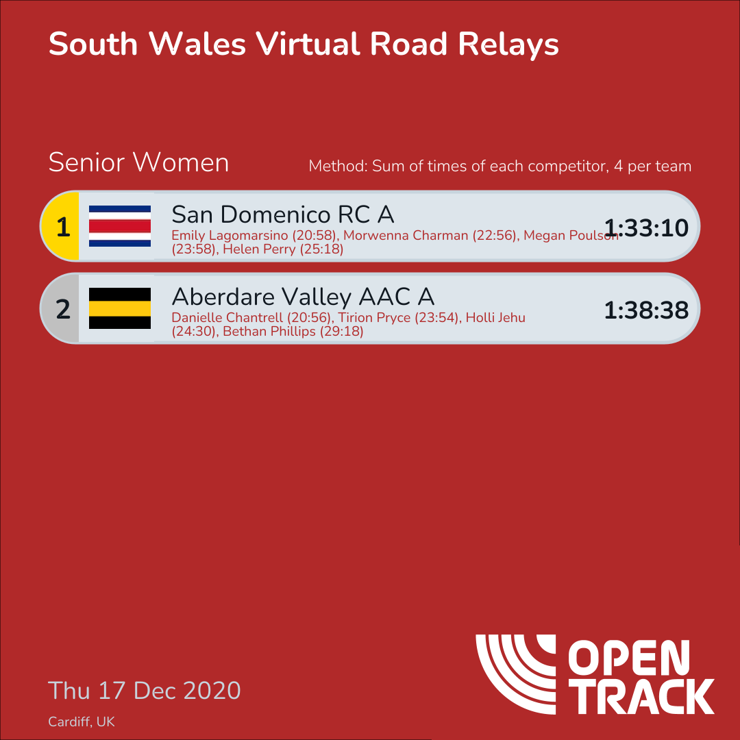 1:38:38 | 1: Danielle Chantrell (20:56), 4: Tirion Pryce (23:54), 6: Holli Jehu (24:30), 9: Bethan Phillips (29:18) |