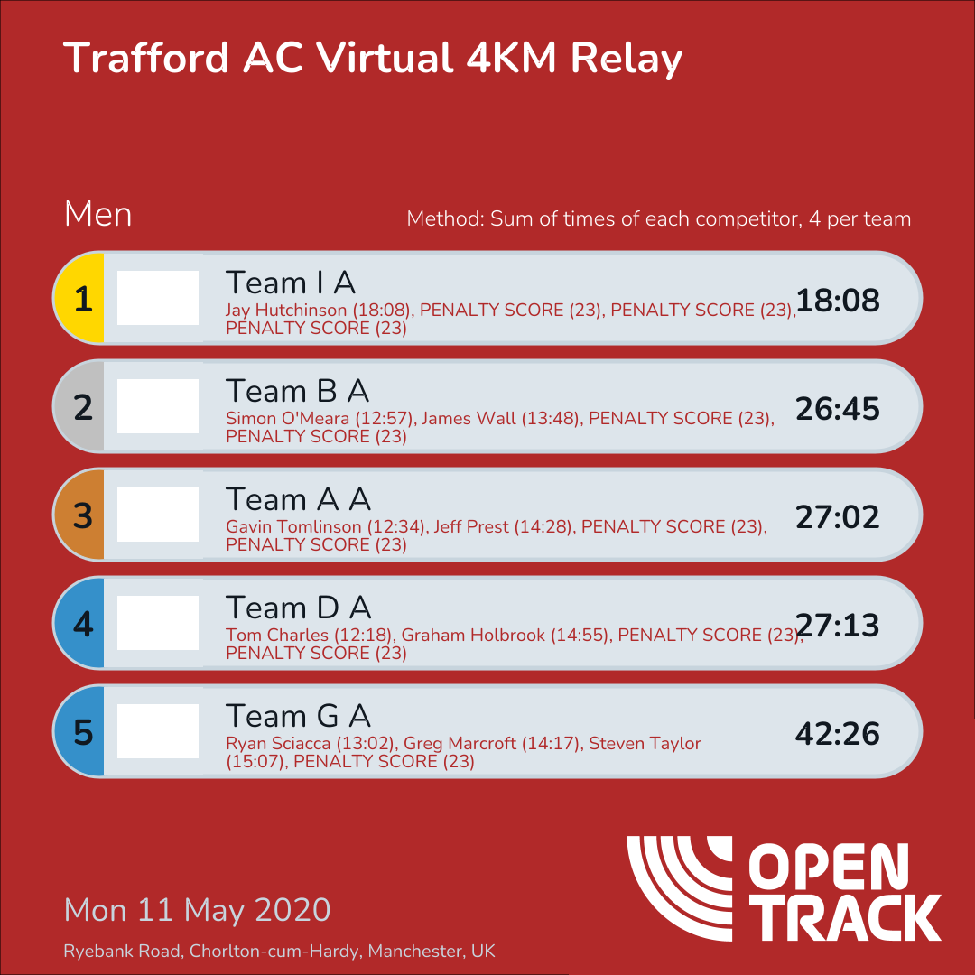 | 8 | TeamC-A | 43:33 | 1: Graham Hogg (12:06), 13: Jack Cooper (14:28), 29: Gareth Woodcock (16:59), 23: PENALTY SCORE (23) | |