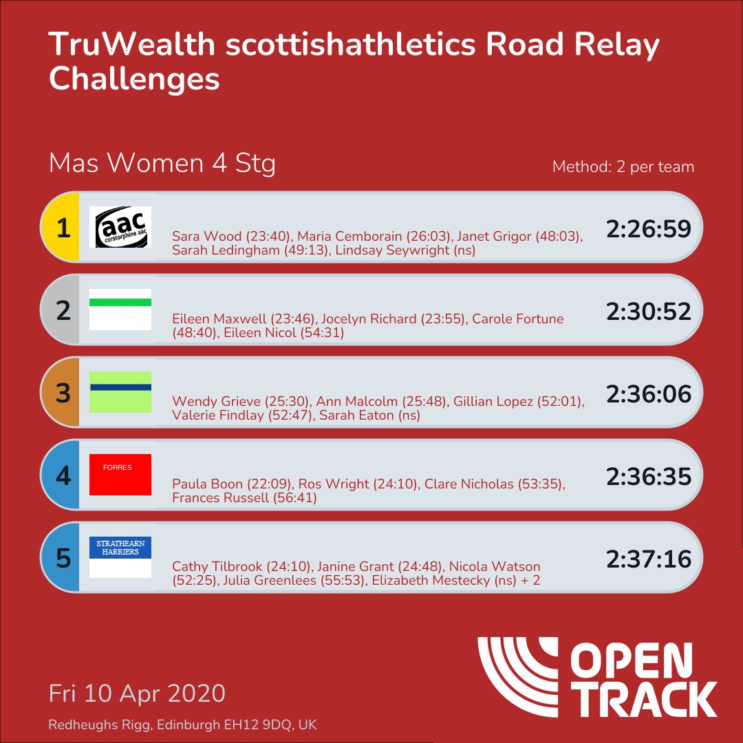 2:37:16 | 340: Cathy Tilbrook (24:10), 358: Janine Grant (24:48), 308: Nicola Watson (52:25), 327: Julia Greenlees (55:53) | |
