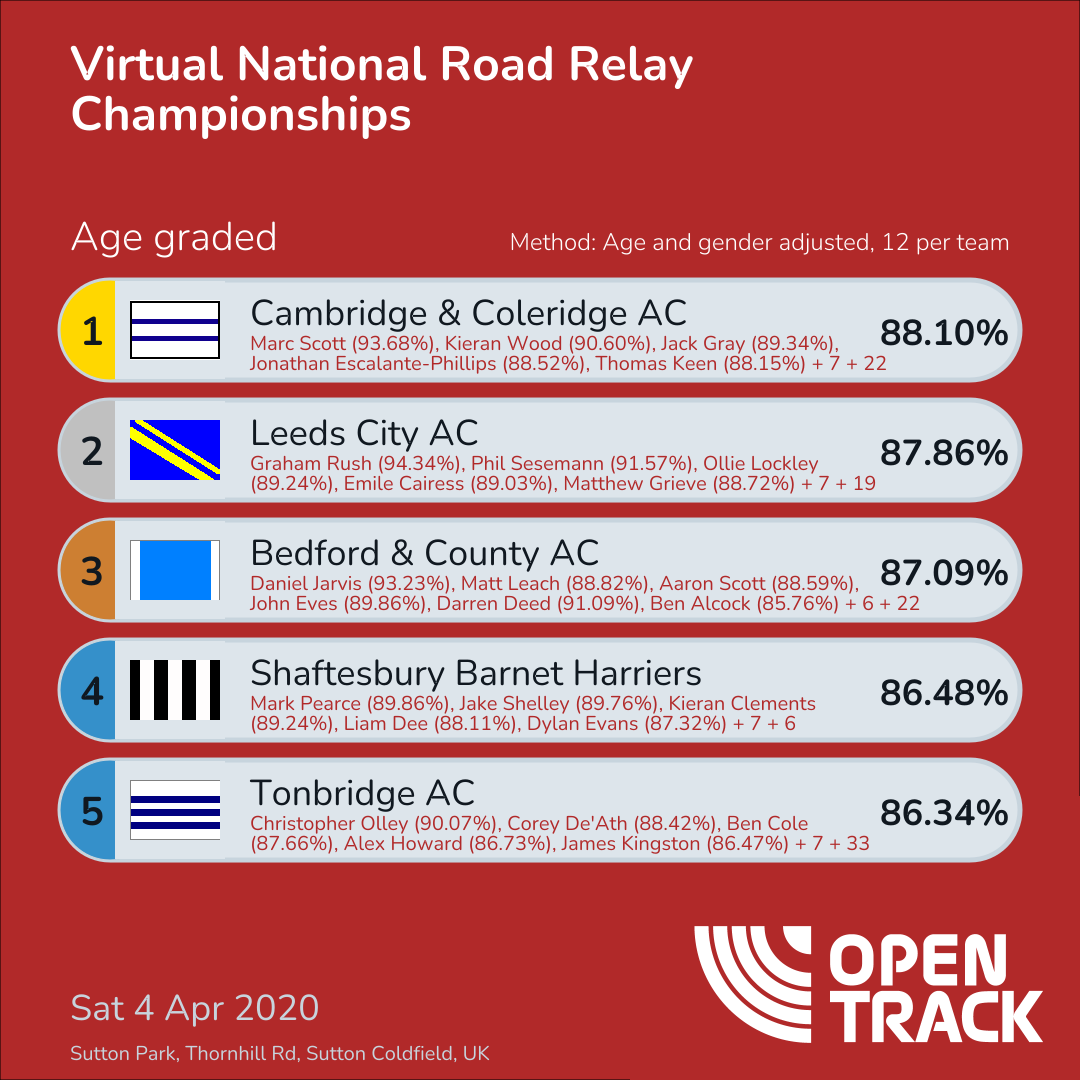 87.86% | 7: Graham Rush (94.34%), 7: Phil Sesemann (91.57%), 21: Ollie Lockley (89.24%), 23: Emile Cairess (89.03%), 26: Matthew Grieve (88.72%), 36: Gordon Benson (88.11%), 60: Joshua Dickinson (86.96%), 67: Linton Taylor (86.63%), 111: Nick Hooker (85.57%), 163: Mohamed Abshir (84.26%), 390: Matt Lockyer (84.22%), 463: Mike Burrett (85.68%) | |