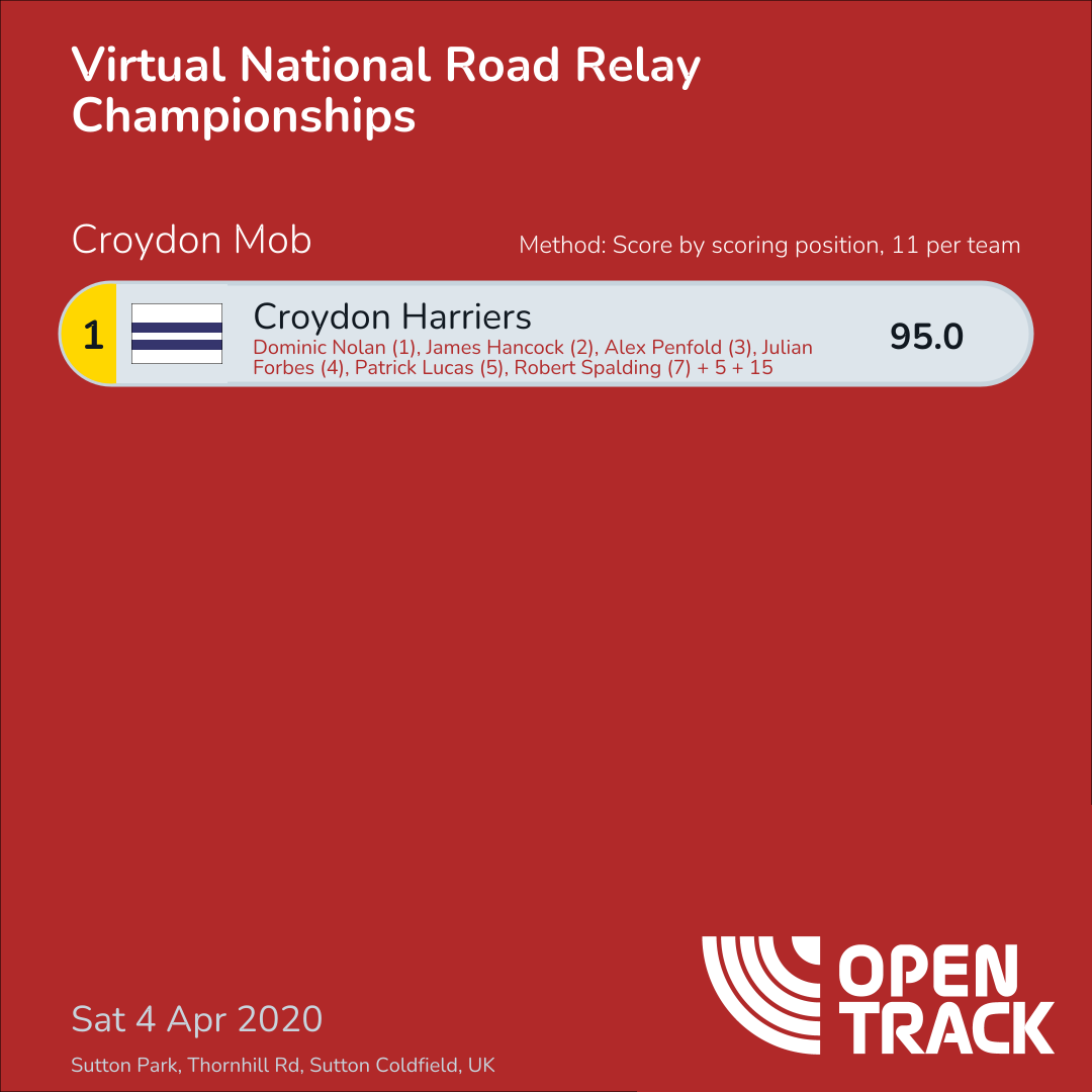 95.0 | 90: Dominic Nolan (1), 202: James Hancock (2), 507: Alex Penfold (3), 836: Julian Forbes (4), 1030: Patrick Lucas (5), 1246: Robert Spalding (7), 1433: Glen Barden (10), 1601: James Nuthall (13), 1924: Henry Butt (15), 2050: James Moore (17), 2074: John Millington (18) |