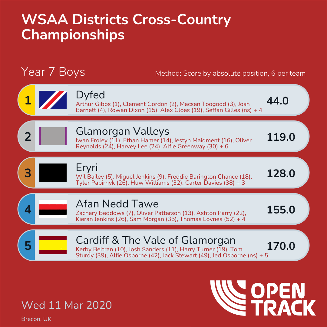 | 6 | SEW | 234.0 | 8: Oscar Nash (8), 23: Vaughan Hughes (23), 36: Iestyn Reed (36), 47: John Newington Bridges (47), 49: Will Vines (49), 71: Greg Young (71) | |