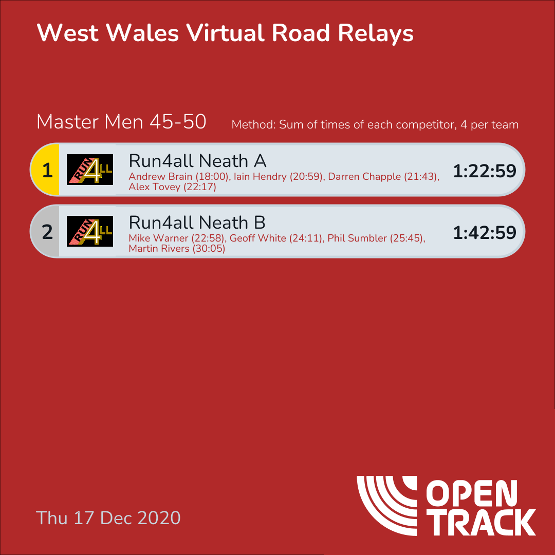 1:22:59 | 1: Andrew Brain (18:00), 6: Iain Hendry (20:59), 7: Darren Chapple (21:43), 8: Alex Tovey (22:17) | |