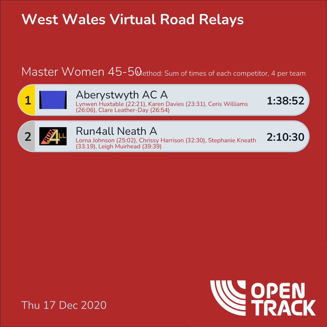1:38:52 | 2: Lynwen Huxtable (22:21), 4: Karen Davies (23:31), 6: Ceris Williams (26:06), 7: Clare Leather-Day (26:54) | |