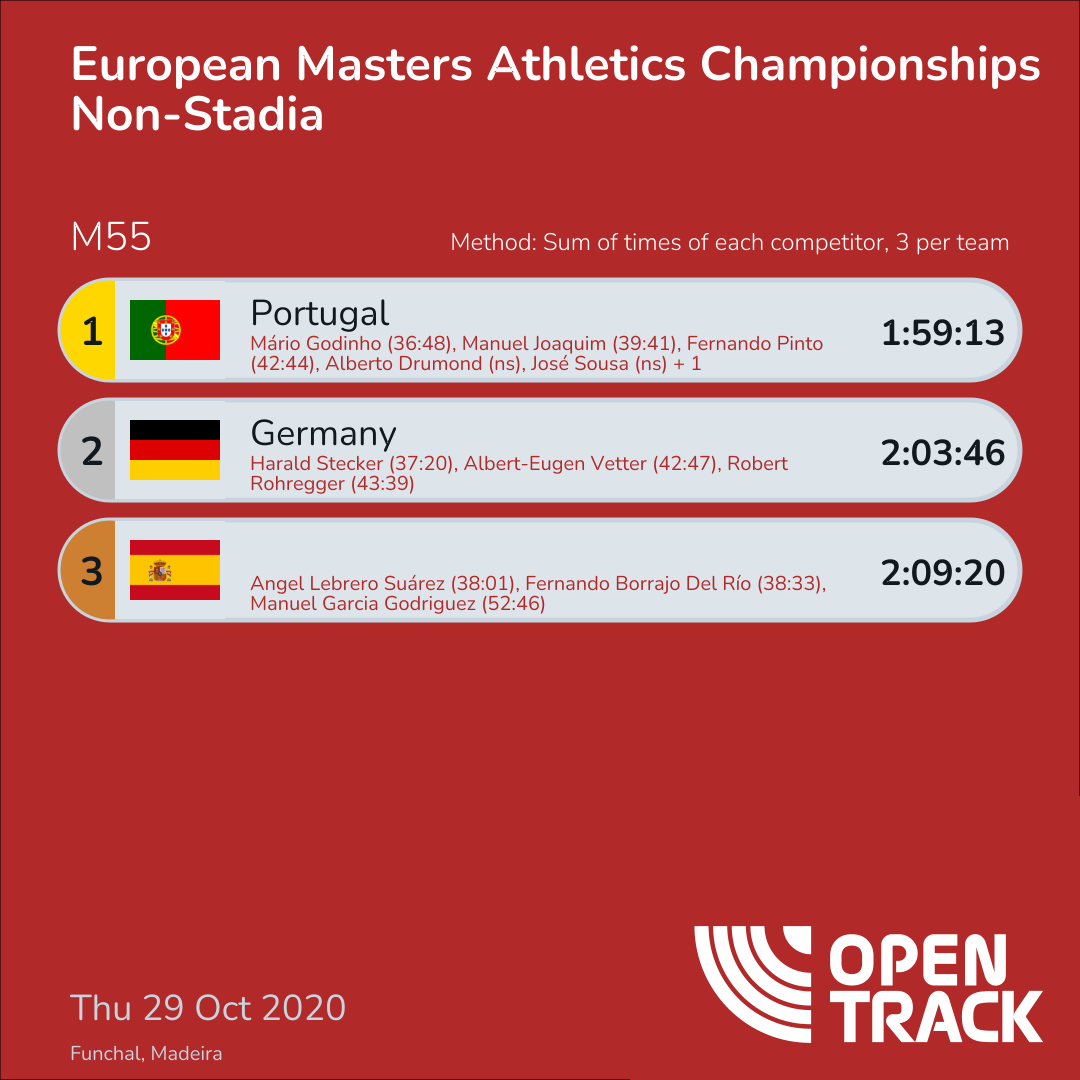 1:59:13 | 30: Mário Godinho (36:48), 58: Manuel Joaquim (39:41), 84: Fernando Pinto (42:44) | |