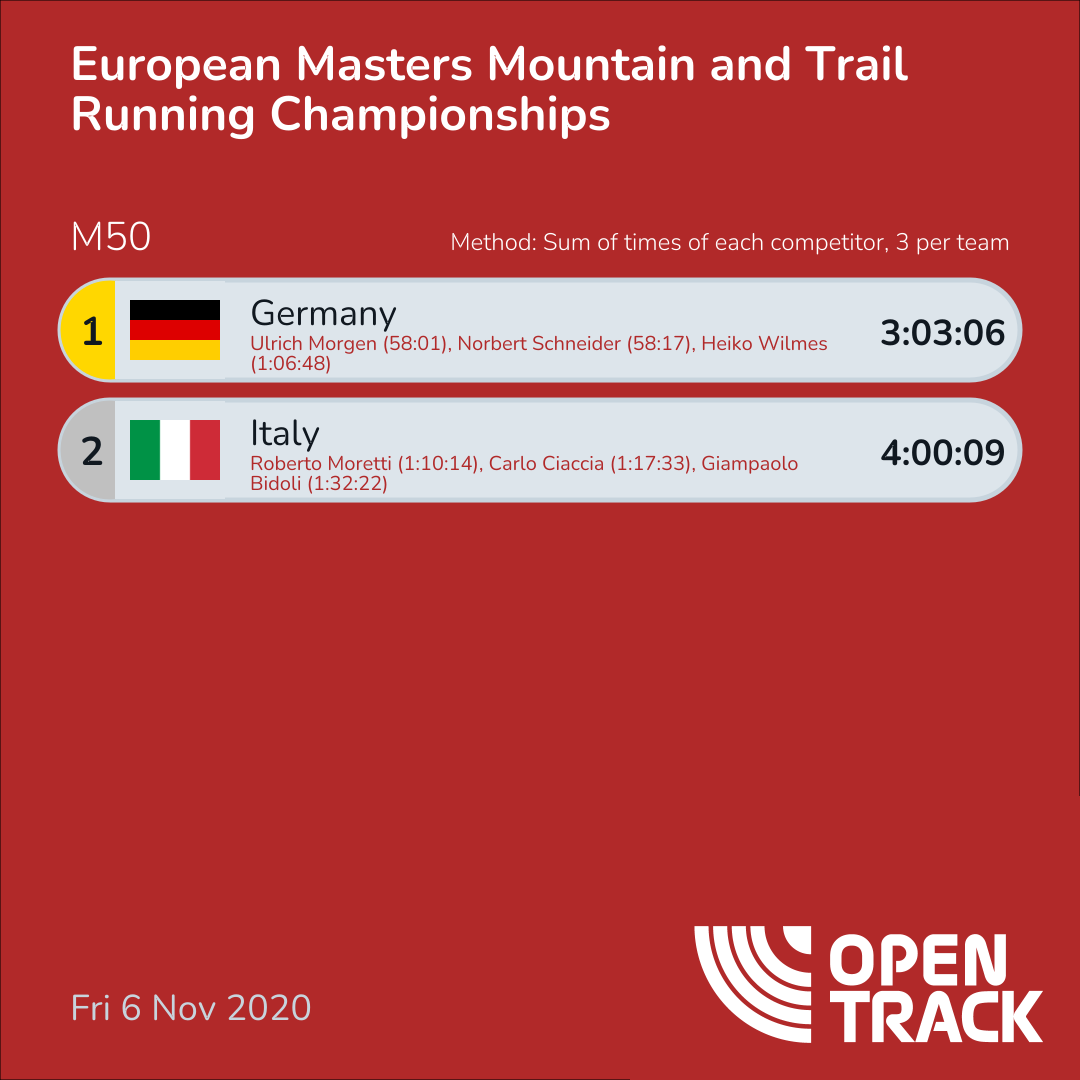 Method: Sum of times of each competitor, 3 per team