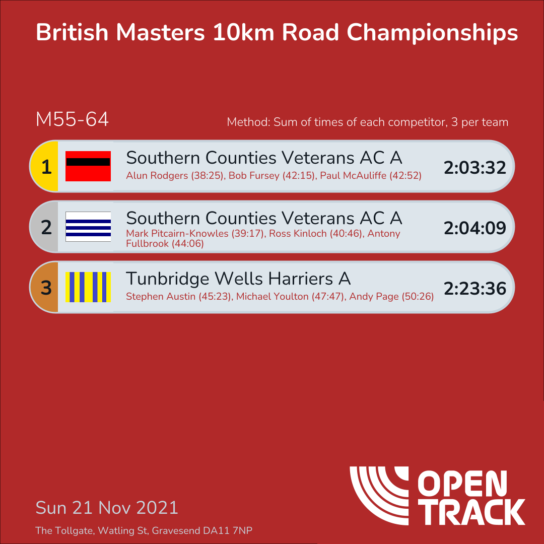 2:04:09 | 58: Mark Pitcairn-Knowles (39:17), 71: Ross Kinloch (40:46), 102: Antony Fullbrook (44:06) | |