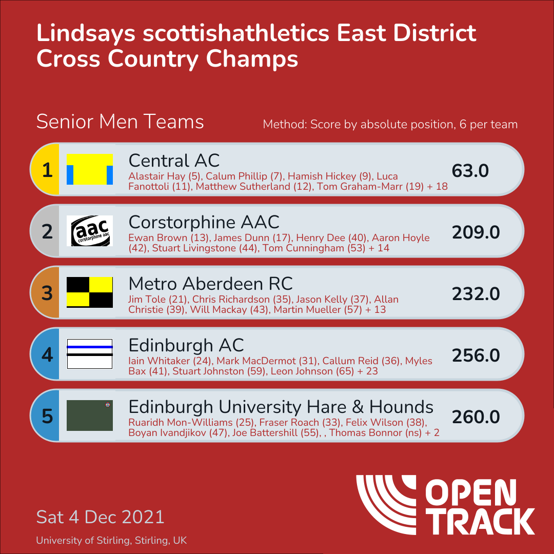 209.0 | 13: Ewan Brown (13), 17: James Dunn (17), 40: Henry Dee (40), 42: Aaron Hoyle (42), 44: Stuart Livingstone (44), 53: Tom Cunningham (53) | |