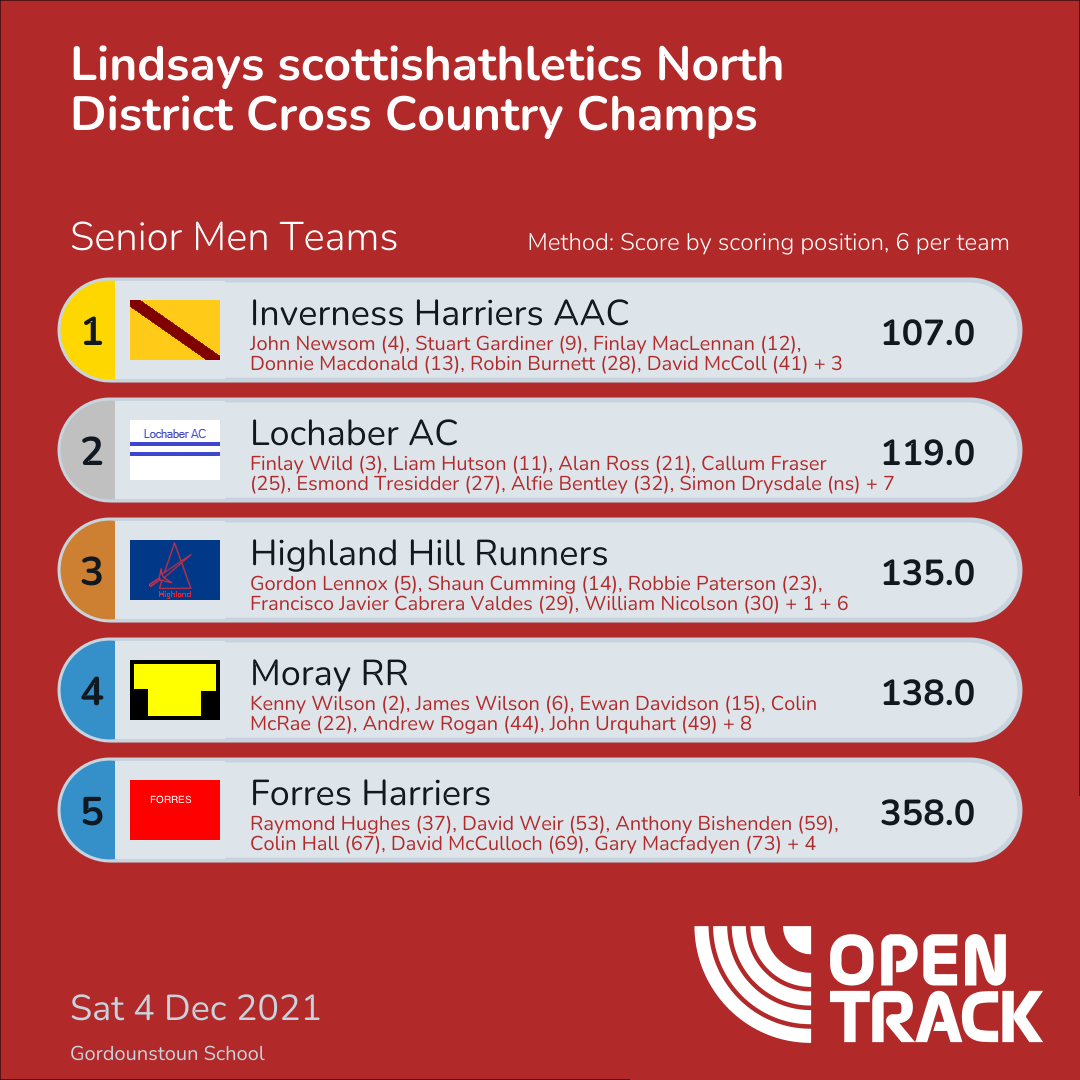 138.0 | 6: Kenny Wilson (2), 11: James Wilson (6), 20: Ewan Davidson (15), 28: Colin McRae (22), 49: Andrew Rogan (44), 55: John Urquhart (49) | |