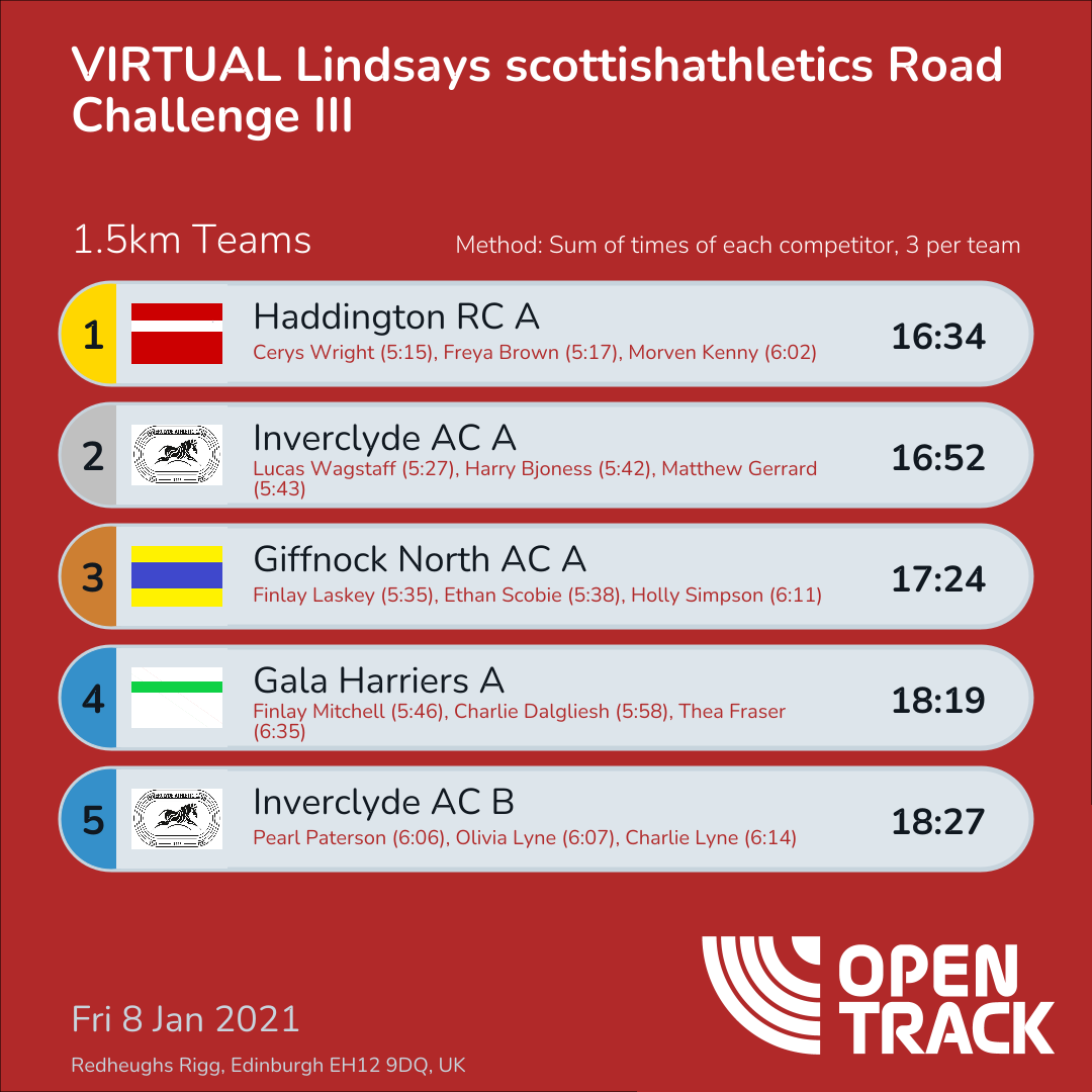 17:24 | 5: Finlay Laskey (5:35), 6: Ethan Scobie (5:38), 17: Holly Simpson (6:11) | |