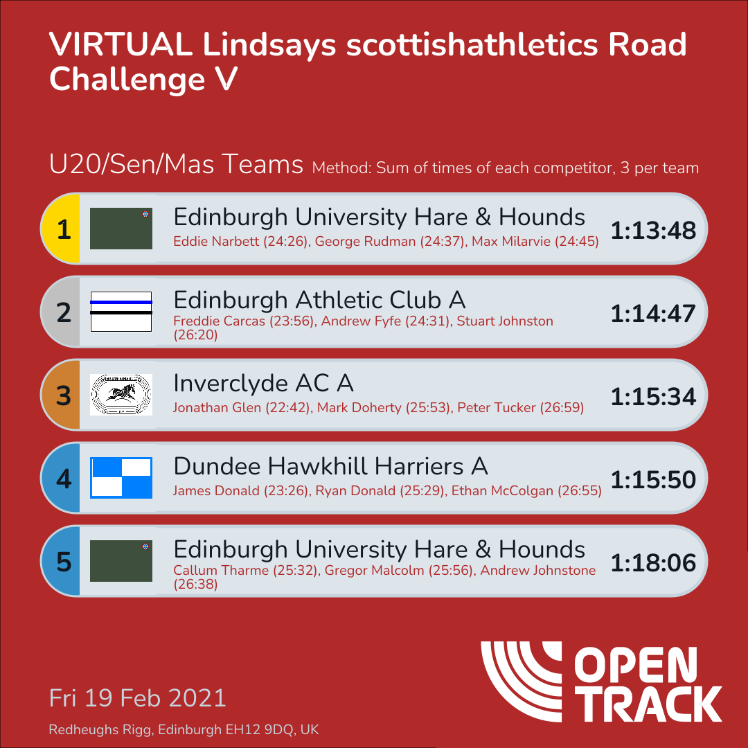 1:19:01 | 16: Stuart Livingstone (26:17), 20: Tom Cunningham (26:22), 20: Cameron Fordyce (26:22) | |