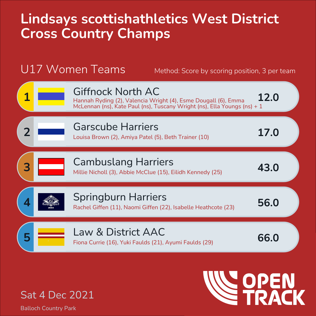 43.0 | 3: Millie Nicholl (3), 17: Abbie McClue (15), 30: Eilidh Kennedy (25) | |