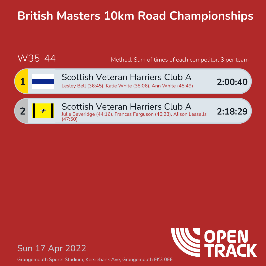 | 2 | CGH-A | 2:18:29 | 64: Julie Beveridge (44:16), 76: Frances Ferguson (46:23), 83: Alison Lessells (47:50) |