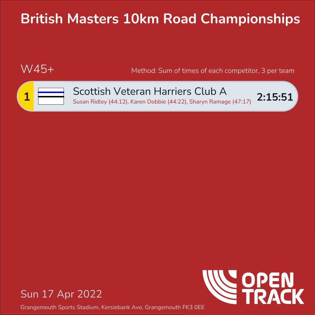 | 1 | EDIN-A | 2:15:51 | 63: Susan Ridley (44:12), 65: Karen Dobbie (44:22), 78: Sharyn Ramage (47:17) |