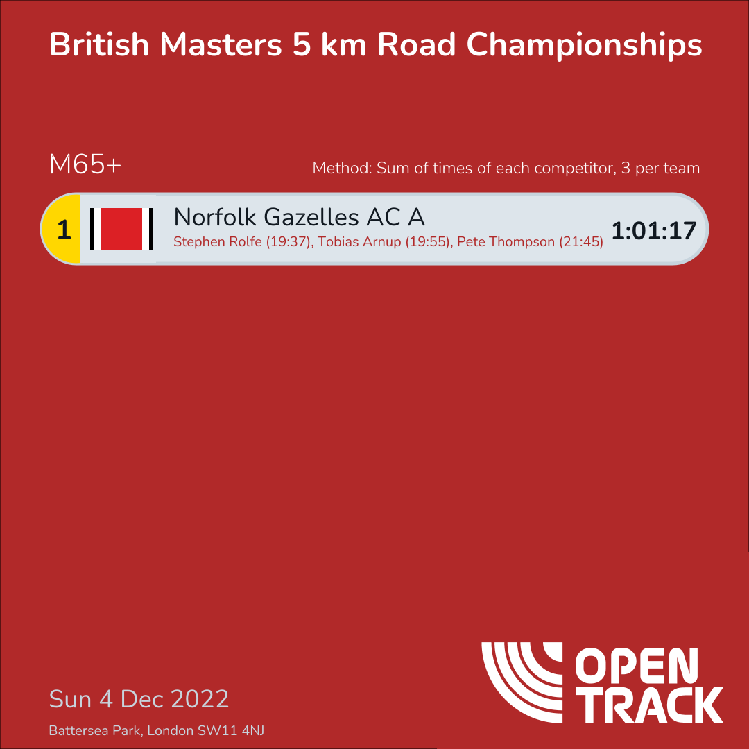 1:01:17 | 103: Stephen Rolfe (19:37), 109: Tobias Arnup (19:55), 137: Pete Thompson (21:45) |