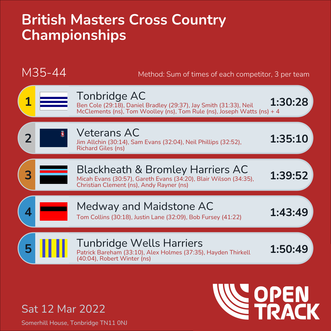 1:30:28 | 3: Ben Cole (29:18), 5: Daniel Bradley (29:37), 24: Jay Smith (31:33) | |