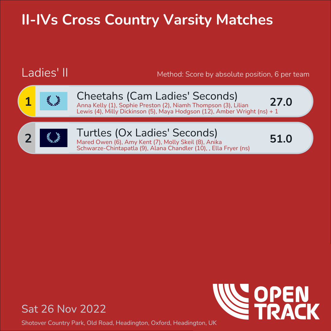 27.0 | 1: Anna Kelly (1), 2: Sophie Preston (2), 3: Niamh Thompson (3), 4: Lilian Lewis (4), 5: Milly Dickinson (5), 12: Maya Hodgson (12) | |