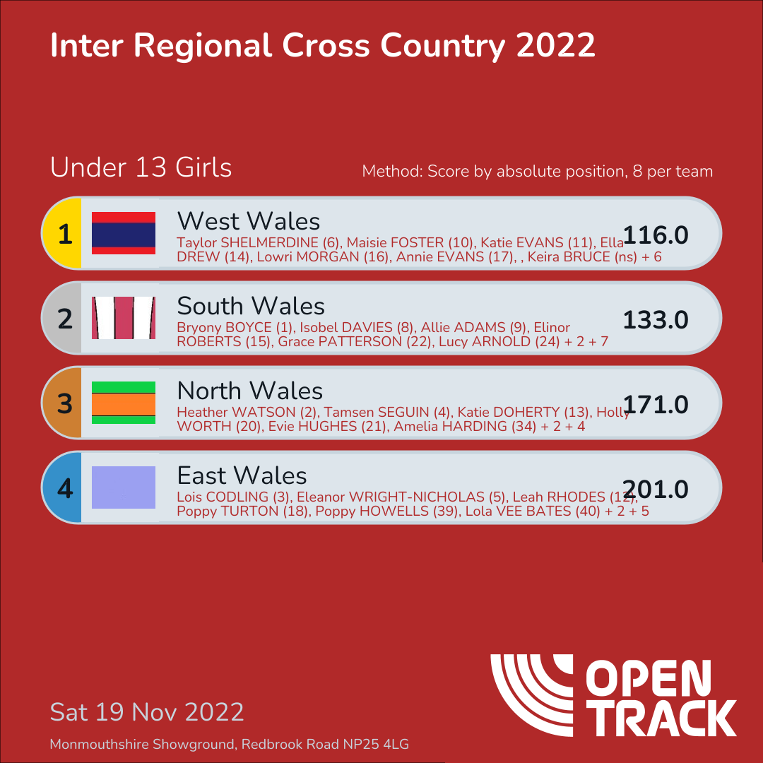 116.0 | 6: Taylor SHELMERDINE (6), 10: Maisie FOSTER (10), 11: Katie EVANS (11), 14: Ella DREW (14), 16: Lowri MORGAN (16), 17: Annie EVANS (17), 19: Esme LYNOCK (19), 23: Hannah JONES (23) | |