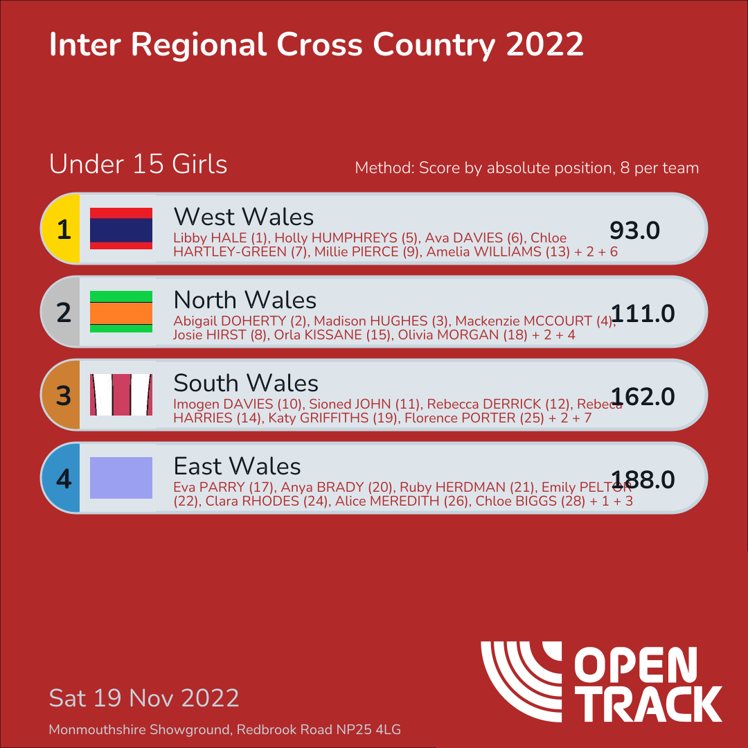 162.0 | 10: Imogen DAVIES (10), 11: Sioned JOHN (11), 12: Rebecca DERRICK (12), 14: Rebeca HARRIES (14), 19: Katy GRIFFITHS (19), 25: Florence PORTER (25), 32: Rhiannon DERRICK (32), 39: Isabelle LEWIS (39) | |