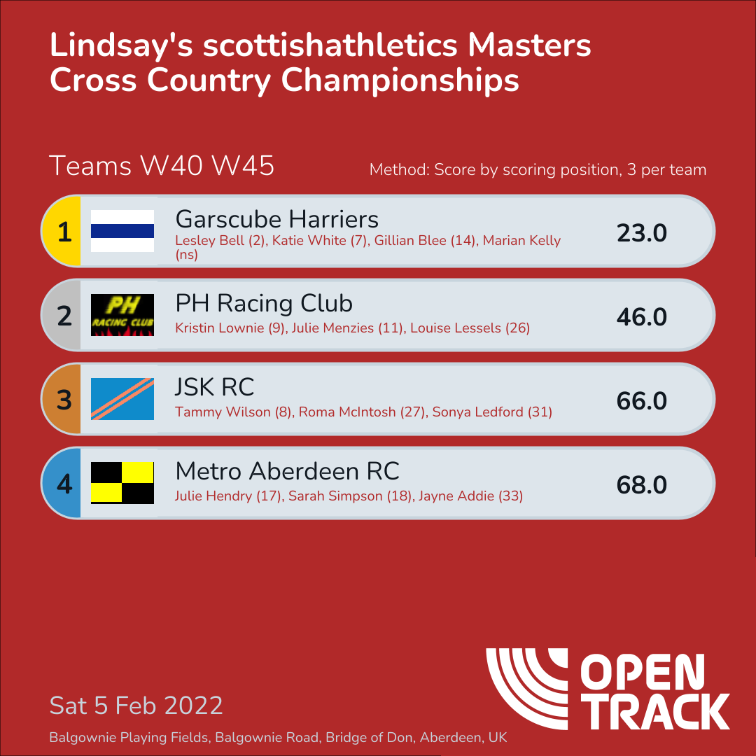 46.0 | 12: Kristin Lownie (9), 15: Julie Menzies (11), 47: Louise Lessels (26) | |