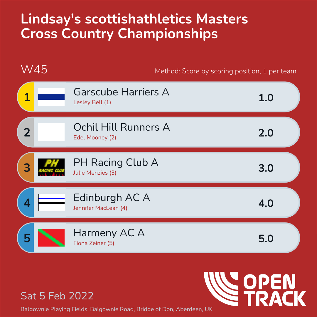 | 3 | 1 | Lesley Bell | W45 |