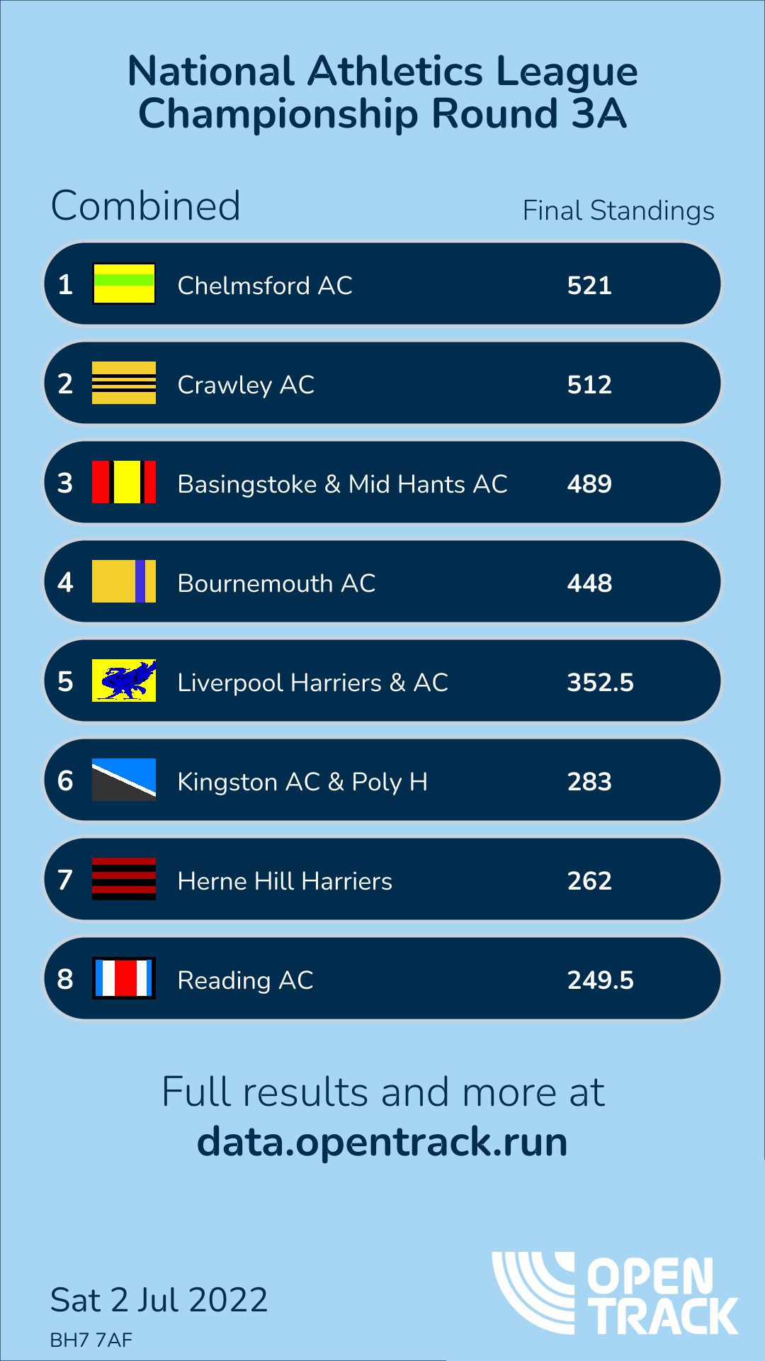 | Men's Shot | 15 | 20 | 13 | 7.50 | 18 | 6.50 | 3 | 10 |